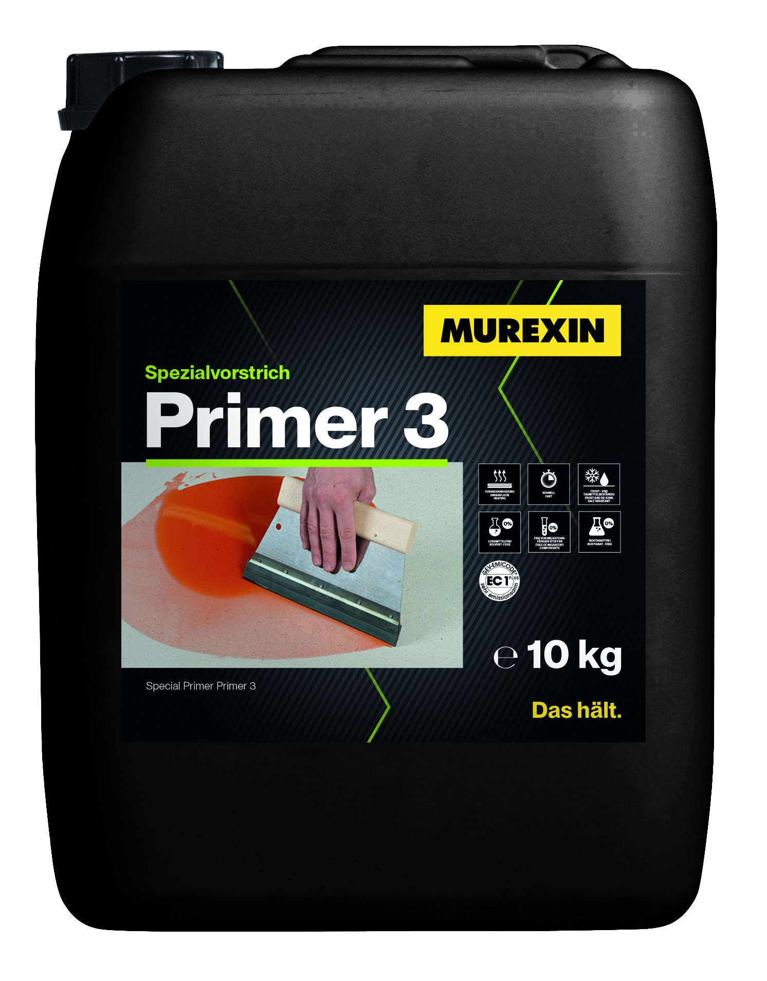 Spezialvorstrich Primer 3 ist eine hochwertige auf Silan basierende, wasser- und lösemittelfreie, roll- sowie spachtelfähige Spezialgrundierung und Dampfbremse ohne migrationsfähige Bestandteile, sowie ohne schädliche Wechselwirkungen mit Murexin Klebstoffen. Zum Vorstreichen von nicht saugenden, sowie von normal bis stark saugenden Untergründen, sowie von sandenden Estrichen vor der Verklebung mit Murexin PU- und SMP-Klebstoffen.